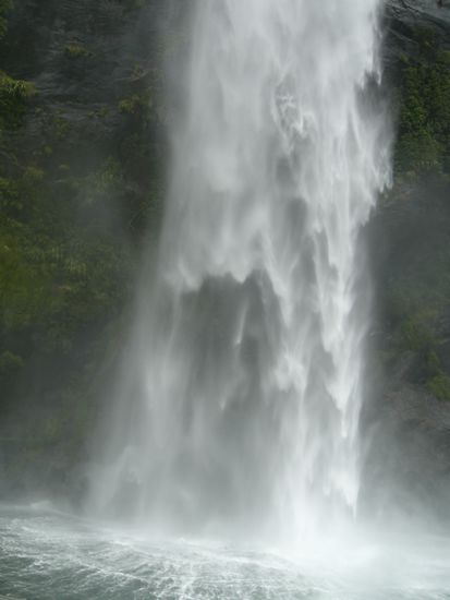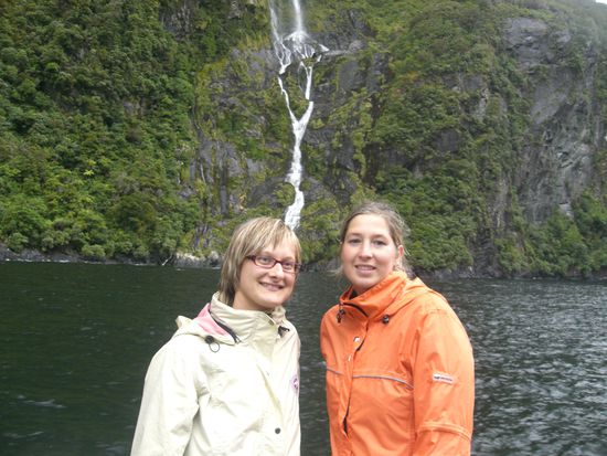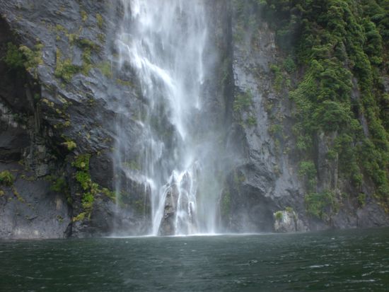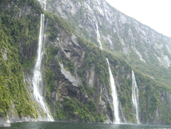 Am Milford Sound angekommen, buchen wir bei MITRE PEAK eine Tour fuer 68 NZ$ pro P. Die Fahrt geht 2h ueber den langen Fiord. An den Seiten baeumen sich die steilen Felswaende auf, von denen immer wieder verschieden grosse Wasserfaelle hinabprasseln.