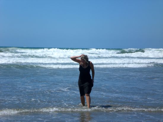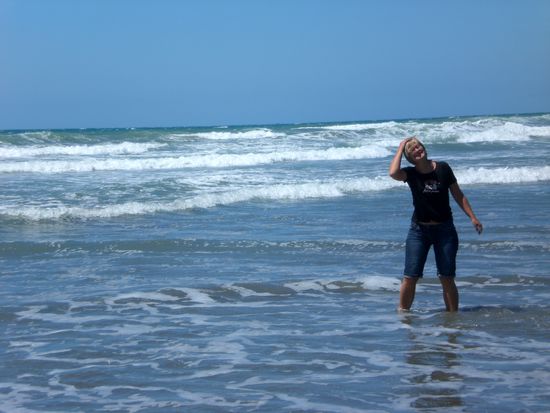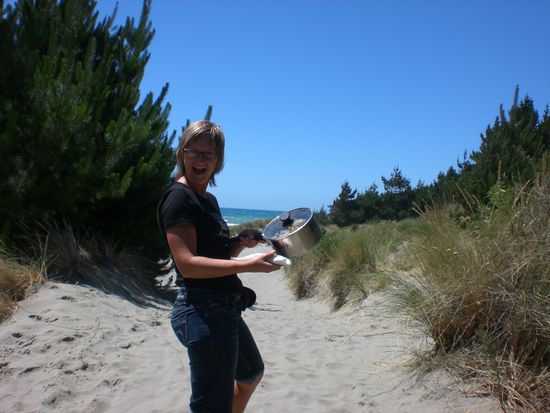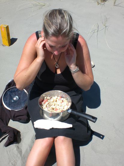 Danach fahren wir weiter und machen nen Abstecher zum Strand. Noch einmal neuseelaendischen Sand zwischen den Zehen geniessen. Ausserdem haben wir ja noch unseren Nudelsalat...den nehmen wir auch mit!