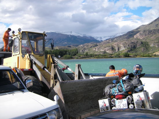 So ging es mit Verspaetung auf die Fahrt, die gut 2 Stunden dauern sollte. Eingeparkt zwischen PKWs und einem grossen Bagger wurden unsere Motorraeder nur mit einem duennen Strick lieblos gesichert. Da das Wasser recht ruhig war sahen wir keine Veranlassung hier weitere Sicherungsmassnahmen zu ergreifen. Die Faehrfahrt fuehrte mit schoenem Blick auf die schneebedeckten patagonischen Berge hinaus auf den Lago. Dieser muss ungefaehr die Groesse des Bodensees haben.