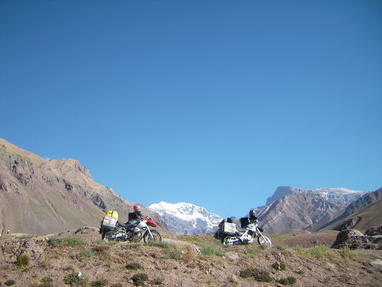 Kurz bevor wir das argentinische Grenzgebäude erreichten, hatten wir einen herrlichen Blick auf den unbewölkten Aconcagua. Dieser höchste Berg ausserhalb des Himalayas präsentierte sich uns bei den vorherigen Überfahrten nur in Wolken.