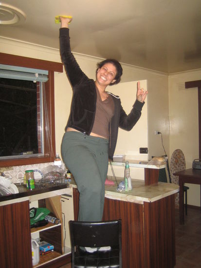 Haha, hier hat Janine versucht, ein Ei in der Mikrowelle zu kochen (nicht nur die Amerikaner versuchen Hamster darin zu trocknen!). Jedenfalls ging sogar alles gut, bis sie den Teller auf dem das Ei lag auf den Tische gestellt hat. Es ist tatsaechlich "Egg"splodiert und unsere komplette Kueche war bis zur Decke mit gekochtem Ei zugedeckt und auch Janine war voller Ei. Da ich in meinem Zimmer war, kam ich leider viel zu spaet deshalb habe ich sie erst fotografieren als eigentlich eh schon alles sauber war. Aber ich dachte einen Eintrag ist es trozdem wert