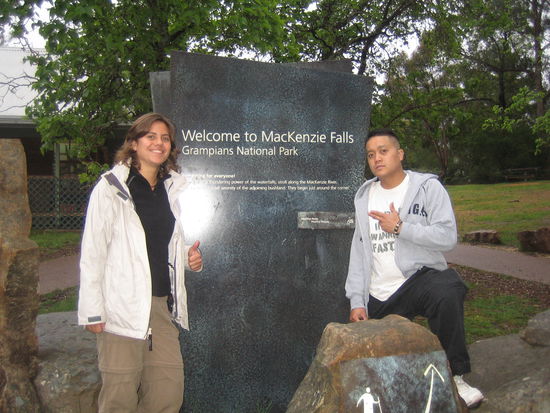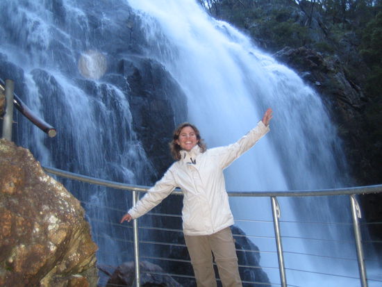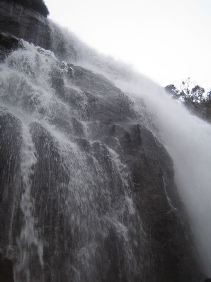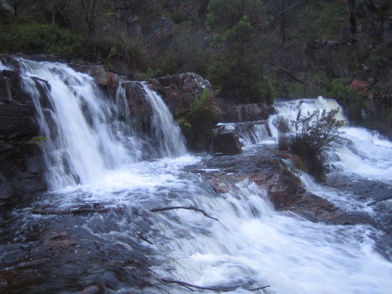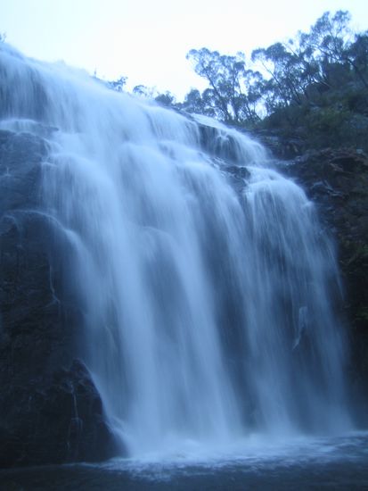 Jedes Jahr das Gleiche: Am 1. Dienstag des Novembers findet der weltweit (?) beruehmte Melbourne Cup statt. Hunderte, ach was sag ich da, zehntausende! Menschen stroemen zu der Pferderennbahn um auf ihr Pferd zu setzen. Damit auch wirklich jeder an diesem Vergnuegen teilhaben kann, hat die Regierung daraus doch glatt einen Feiertag gemacht. Wenn man also am Montag blau macht, hat man ein wunderschoenes langes Wochenende. Genau das war es auch, was Myke dazu antrieb rauf in die Grampians, einem Gebirge in Victoria, zu fahren. Los ging es also am Samstag Mittag. Vorhergesagt waren (wie kann es anders sein?!) Regen. Da man den Regen hier bei uns aber wenn ueberhaupt gerade mal als Nieselregen bezeichnen wuerde, dachte ich: no problemo. Auf der Hinfahrt wurde uns dann aber spaetestens als wir wegen einer ueberfluteten Strasse anhalten mussten klar, dass es ausnahmsweise wohl doch mal wirklich regnet. Aber wo man schon auf dem Weg ist, dreht man natuerlich nicht um. Als wir also in der Daemmerung ankamen, mussten wir in Windeseile unser Zelt aufbauen. Um wenigstens noch ein bisschen vom Tag zu haben, beschlossen wir, uns einen nahegelegenen Wasserfall anzuschauen. Drei Deutsche erklaerten uns, man muesse nur 10 Minuten mit dem Auto dorthin fahren. Nicht mit einkalkiliert waren aber Sturm und Nebel. Wobei der Nebel kein Nebel war, sondern eine weisse Wand. Wie wir angekommen sind weiss ich bis heut noch nicht, jedenfalls waren wir dann soweit oben, dass der Nebel unter uns lag.