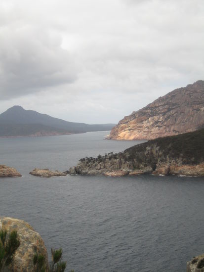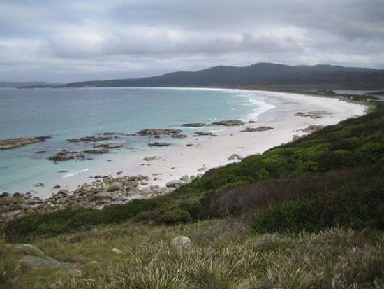 Der beruehmte Freycinet Nationalpark mit Wineglass Bay. Wineglass deshalb, weil die Fischer damals immer die Walefaenge in die Bucht transportiert haben und durch deren Blut hat sich das Wasser dann immer rot gefaerbt...