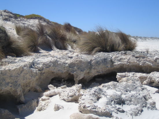 Nach dem Meeresteil ging es auf in das andere Extrem: Little Sahara. Das ist eine riessige Sandduene. Nachdem wir eine halbe Stunde durch den Sand laufen mussten (nicht zu vergessen: bei 37 Grad und bruetender Sonne) und wir uns alle die Fuesse verbrannt hatten, musste wir auch noch auf die Duene hinauf klettern, damit wir Sandboarden konnten. Man koennte es auch kostenlose Zahnpolitur nennen, da besonders grinsende Menschen wie ich bei der Abfahrt den ganzen Sand zwischen den Zaehnen hatten.Selbst abends beim Essen hat es noch geknirscht!