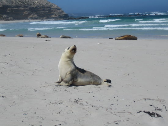 Da so ein Strand zugegebenermassen ganz nett aussieht, aber nicht unbedingt Highlight einer Tour ist, raubte es uns um die Ecke schier den Atem. Hunderte Australische Seeloewen erwarteten uns dort am "Seal Bay". Mit einer Rangerin durften wir ganz nah an den Tieren vorbeigehen, allerdings immer mit einem Sicherheitsabstand von 10 Metern, da Seeloewen (natuerlich hauptsaechlich die Maennchen) sehr aggressiv sind.