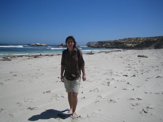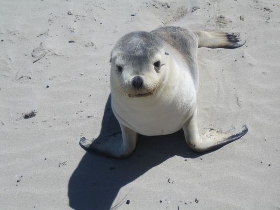 Wir hatten ausserdem das Glueck, dass zur Zeit die Jungtiere am Strand sind. Und noch mehr Gluek hatte ich, als ein Jungtier auf mich zugewatschelt kam. Es war auf der Suche nach seiner Mutter und da hatte es mich wohl verwechselt. Jedenfalls kam es bis zu meinen Fuessen, wo mir etwas mulmig wurde, weil die Rangerin mich warnte, dass auch die Jungtiere beissen koennen und ich mich deshalb nicht bewegen sollte. Als ich sein jaulen nicht erwiederte watschelte das Kleine dann irgendwann wieder davon.