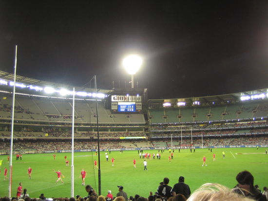Da wir die AFL (Australian Football League) natuerlich seit je her verfolgen, wussten wir nun dass Collingwood (Melbourne)vs. Sydney Swans um den Einzug ins Halbfinale kaempft. Wir waren also auf einem Viertel Final Spiel 9das erklaerte dann auch den Ticketpreis). Ich wusste sofort, dass Collingwood gewinnen wuerde, wurden sie doch immer unfair getacklet (was man daran erkennt, in welcher Hoehe der Angreifer ans Bein fasst, hab ich mit meinen Contactlinsen aus 500 Meter Entfernung natuerlich sofort erkennen koennen! ). Als Bonus gab es dann noch einn typischen "Four 'n Twentiy", ein Kuechlein gefuellt mit Hackfleisch und dann in Ketchup ertraenken. Das ist dann das Einzige typisch australische Essen. Und das ist mein purer Ernst!!! Ach ja, erwaehnenswert waeren viielciht noch die ca. 5 Millionen Moewen, die ueber dem Melbourne Cricket Ground geschwebt sind und spaeter das Football Feld besiedelt haben (ein wunder das alle ueberlebt haben, glaub ich zumindest). Leider ging dann der Akku meiner KAmera alle, sodass es nur eine beschraenkte Auswahl an Bilder gibt. War doch klar, oder ?