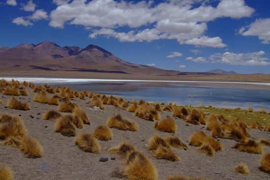 Nach einer ziemlich langen Fahrt hielten wir an einem Ort, wo sich zwei Vulkane befinden (einer ist noch aktiv, und aus dem Krater stieg Rauch auf.) Unterhalb der Vulkane hatte sich die uralte Lava zu Stein gebildet, und unsaegliche Steinformationen sind dadurch entstanden. Es war ein komisches Gefuehl, sich auf versteinerter Lava zu bewegen. Danach gings weiter und irgendwann trafen wir auch endlich auf die erste Lagune mit rosaroten Flamingos. In der weiten Andenwueste auf Wasser und Flamingos zu treffen, war fantastisch! Indessen hatte sich Fahrer und Koechin soweit erholt, und es gab ein leckeres Mittagessen. Die Fahrt danach fuehrte weiter ueber unberuehrte Sandebenen, wir befanden uns total alleine im Nichts und immer die Anden rechts vor uns. Es war eindruecklich! Ein weiteres Highlight war auch der "Stonetree", eine Felsformation, die wie ein Baum aussieht, und vom staendigen Wind so geformt wurde. Doch das absolut Genialste besichtigten wir am Abend, wo wir dann auch uebernachteten: An der Laguna Colorada! Mitten im Nichts taucht die rote Lagune auf, gespickt von rosaroten... und weissen Salzraendern. Ein Genuss fuers Auge! Solche starken Farben in dieser sonst so grau-braunen Andengegend habe ich nicht erwartet! Wir schauten dort den Sonnenuntergang und wie sich die Farben veraenderten, einfach wunderschoen! Am Abend gabs als Dessert Guetzli und zum Essen sogar Wein, der Fahrer und die Koechin waren total nett: Irgendwie hatten wir das Gefuehl, dass sie sich fuer irgendetwas entschuldigen wollten?!