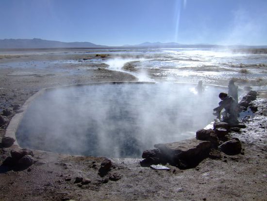 3. Tag: Am Morgen mussten wir um 4:30 aufstehen, um um 5Uhr abzufahren. Und siehe da, alle waren um 5Uhr bereit, sodass die Reise um 5:10Uhr losgehen konnte! Waren wir alle froh und gluecklich darueber! Die Geysire waren fruehmorgens am Eindruecklichsten zu Beobachten. Eiskalt wars, so frueh morgens. Schliesslich befanden wir uns ca. auf 4200m. Wir zogen unsere warmen Jacken an, Kappe und Handschuhe. Die Geysire dampften mystisch in der aufgehenden Sonne. Es waren einige, auf einer Flaeche verstreut, die zischende Laute und stinkende Daempfe von sich gaben. Wir sahen auch blubbernde, suettigheisse Schlammloecher, die teilweise ihren sulfathaltigen Schlamm mit einem lauten Blubbern und Zischen in die Hoehe spien. War echt spannend zu beobachten!