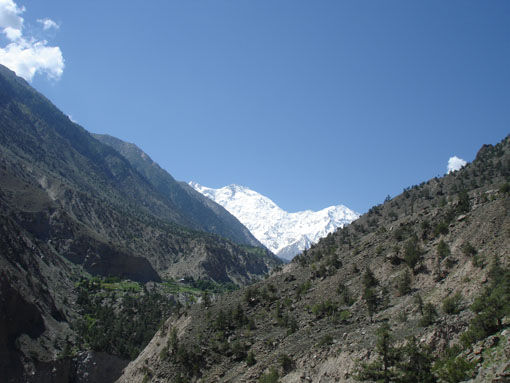 Der Nanga Parbat ruft. Mit Bus und Jeep geht's zum Ausgangspunkt. Ich habe ein wenig Bangen vor meiner größten körperlichen Herausforderung dieser Reise. Die ersten 5 Stunden führt ein Schotterweg hinauf zur Fairy Meadows, der Märchenwiese, in Süddeutschland auch Alm genannt. Not macht erfinderisch. Ich will nicht alleine hinaufklettern. Dreist wie ich bin, quatsche ich 4 pakistanische Reisende an, die mich gerne begleiten. Nadeem und Hammad sind studierte, gebildete Weltbürger, die sehr an Reisen interessiert sind und viel wissen, 2 junge Männer, Kamran und Amir (einer schöner als der andere) versüßen ebenfalls den beschwerlichen Weg.