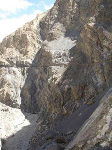 Die Geröllpiste, oft verschüttet durch herabfallende Gesteinsmassen windet sich entlang des Karakorum