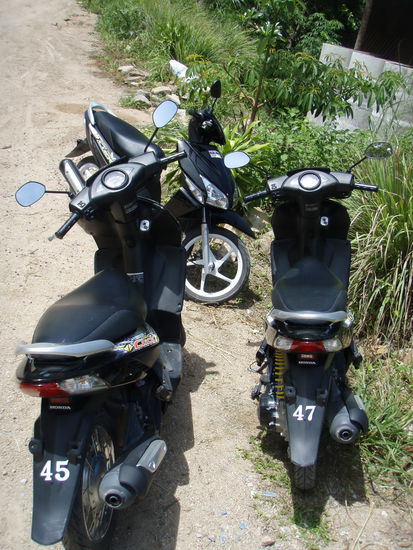 Keine Insel ohne ordentliche Tour mit landestypischen Geraeten. Kaum waren wir aus unserer Schlafunterkunftshuette raus, sassen wir auch schon auf drei niegelnagelneuen schwarzen Honda-Hobeln. Natuerlich vollautomatisch und mit 125 ccm.