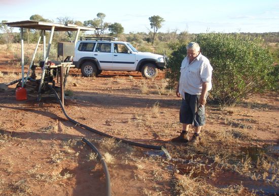 Since a few years, Sid was building up his home for retirement on this land. He had a small garden growing watermelons, pumpkins and flowers. Being proud of his work he showed us his solar power station which provides the necessary enegery for living. Another striking thing was his water bore hole, where he gets unlimited access to water.