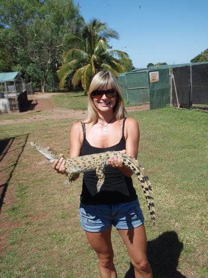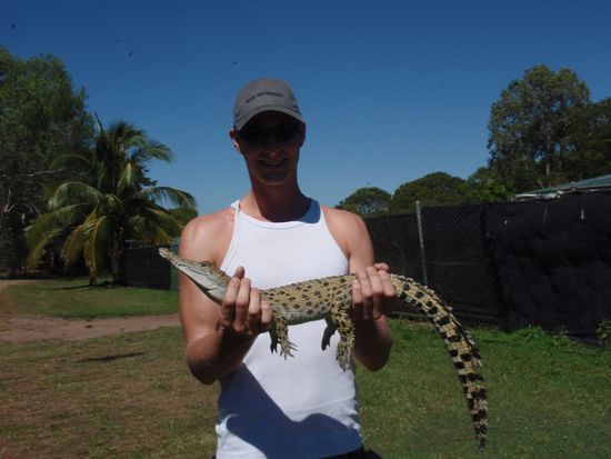 Am Ende unseres Farmbesuches hatten wir die einzigartige Möglichkeit ein 1jähriges Babykrokodil auf den Arm nehmen zu können. Unerwarteterweise fühlte es sich ganz weich an. man kann sich gar nicht vorstellen, dass das mal ein 7m langes, unter Umständen aggressives Salzwasserkroko wird.