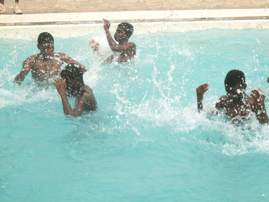 Zum Auflockern wurden dann Teamspiele gemacht. Und am letzten Tag ging's ins Schwimmbad. Das hat mich super gefreut, weil die Jugendlichen tatsächlich baden gegangen sind. Normalerweise haben die Beniner ja Angst vorm Wasser und können nicht schwimmen. Die meisten konnten auch nicht schwimmen, aber sie haben es versucht oder sind einfach im Nichtschwimmerteil rumgehüpft. Das hat mich richtig gefreut. Das genialste waren allerdings meine Zwillinge. Da Beniner ja wie gesagt selten schwimmen gehen haben auch die wenigsten Badesachen. Géraud hat sich mit einer schwarzen Minibadehose noch recht gut gehalten. Yves allerdings hat zu einer weißen (und nach kurzer Zeit äußerst durchsichtigen) Baumwollunterhose gegriffen. Ach Gott, ich habe mich köstlich amüsiert. Und das schönste war: Es war ihnen einfach wurscht!