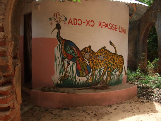 Dann waren wir im historischen Museum von Ouidah. Das ist auch ein altes KOlonialgebäude, wie die meistens Museen in den Küstenländern Westafrikas. IN diesem Falle ein ehem. portugiesisches Herrenhaus mit dazugehörigem Hof. Im Keler des Gebäudes ist inzw. eine Kunstsammlung zusammengetragen. Es gibt Tagmasken und Nachtmasken für Voodoo-Riten und -Tänze, wurde uns erklärt. Man erkenne das da und da dran, ein sehr eindeutiger Unterschied, der für uns beide völlig unsichtbar war Und für jeden Anlass eine Maske, mit Bildern und Figuren drauf. Teilweise sind die Dinger (sie werden quasi als Hut auf dem KOpf getragen) einfache Platten, teilweise sind sie fast einen Meter hoch.