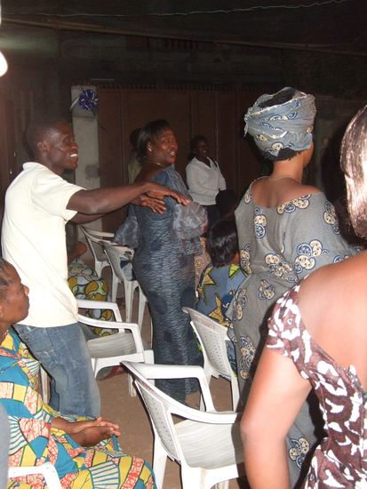 Naja. Drei Wochen später war es dann also soweit. Die NAchtwache. Normalerweise wird das die Nacht vor der Beerdigung gemacht. Aber da viele Leute aus Cotonou nicht mit nach Abomey kommen konnten, gab es quasi zwei. Es wurde eine rießige Zeltplane direkt vor unser Tor gespannt - also mitten auf die Straße. Da wurde dann ein kleiner Altar aufgebaut und eine Band kam und unzählige Stühle. Es wurde bis nachts gesungen und gebetet und der Pfarrer hat echt tolle Dinge gesagt. War sehr schön. Ich musste die ganze Zeit an die Beerdigung meiner Omi denken... Aber alles war natürlich anders als in Deutschland. Man feiert mehr, es wird viel gegessen, gelacht. Ständig muss man sich um die Kinder kümmern (eine Aufgabe die ich auch zu Hause immer sehr gern übernommen habe). Im Grunde ist es ein einziges rießiges Familientreffen.