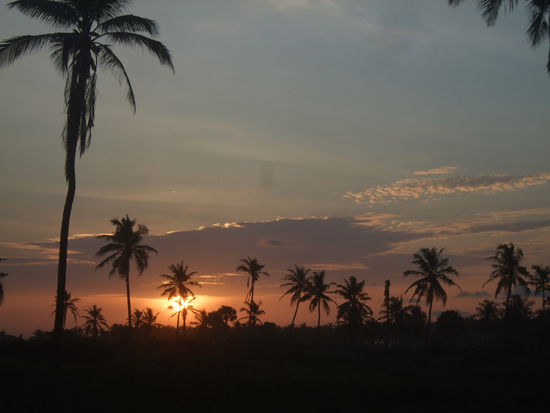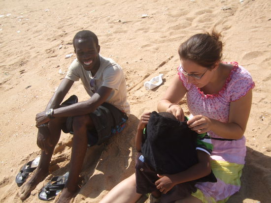 So saßen wir also nachts an der rauschenden Atlantikküste, mit Lagerfeuer nebendran und dem sternenklaren Himmel oben drüber, während sich der Meereswind mit den afrikanischen Urgesängen und dem Trommelklang verwebte. Klingt kitschig, war aber so Geschlafen haben wir dann auch in einer dieser Strohhütten am Strand, voll romantisch!! Und in der Früh sind Issa und ich extra aufgestanden um den Sonnanaufgang anzuschauen. Wir haben uns die Zeit erstmal mit den kläglichen Versuchen, Krabben zu fangen, vertan. Aber DANN!!! mahu, das Warten hat sich wirklich gelohnt!!
