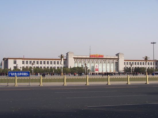 Eigentlich wäre ich am liebsten straight ins Hotel gefahren, aber jetzt hieß es erstmal "lunch in local restaurant" gemäß itinerary. Hungrig war ich überhaupt nicht, aber das so hochgelobte chinesische Essen reizte mich dann doch. Das Restaurant war ungemütlich und ohne jede Athmosphäre, aber ich sollte lernen, daß Chinesen auf Schnickschnack keinen Wert legen. So ca. 9 Teller und Schüsseln kamen gleichzeitig auf den Tisch, vor mir hatte ich ein kleines Tellerchen, ein kleines Schüsselchen, einen Porzellanlöffel und Stäbchen. Ich war ja nun nicht das 1. Mal in Asien, sondern schätzungsweise das 15. Mal und wußte, was zu tun war. Es war okay. Nicht überragend, aber okay. Chinesisches Essen ist nicht unbedingt hübsch anzusehen und meist auch ein wenig undefinierbar, aber ich bin nicht anspruchsvoll und so typisch norddeutsches Zeug wie Grünkohl und Rübenmus ist optisch ja nun auch nicht wirklich der Bringer. So klapperte ich ein Weilchen mit den Stäbchen und war dann echt happy, als es ins Hotel ging. Days Inn Forbidden City, ein Hotel so zentral, wie es zentraler kaum noch geht. Interessanterweise verlangte man dort eine Kaution von 300 Yuan, die ich per Kreditkarte hinterlegte, eine Praxis, die in China wohl üblich ist. So ! Boxenstopp ! Einmal auf´s gemütliche Bett schmeißen, ein kleines bisschen ruhen, T-shirt-Wechsel und dann endlich raus auf die Straßen Pekings ohne Guide! Es dauerte nur 5 Minuten und ich stand staunend vor dem Tor des himmlischen Friedens !