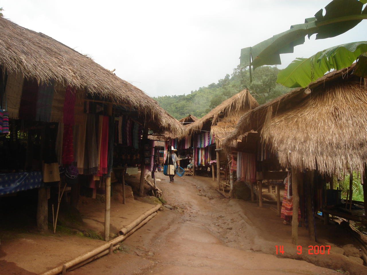 Also wurden wir wieder in den Bus geladen und auf gings zum goldenen Dreieck. Zu einem Bootsanleger am goldenen Dreieck. Und es schien keine Wahl zu geben ob man an Land und damit im scheinbaren Nichts bleiben oder fuer 320 Baht/Person in ein Boot zu steigen. Das Boot fuhr einmal ueber den Mekong zu einem kleinen laotischen Shoppingdorf. Erinnerte stark an die Butterfahrten in China...