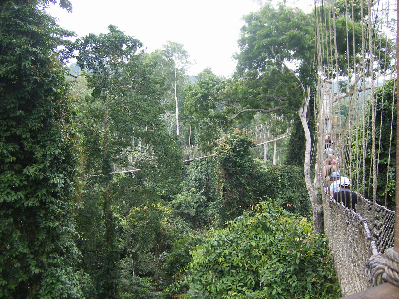 Nördlich von Cape Coast befindet sich der Kakum National Park. Wunderschön gelegen, ganz gemütlich, mit einem teuren Restaurant. Aber der Canopy Walkway war dann doch ein Reinfall. Es sind 6 Hängebrücken auf Baumkronenhöhe, die einen kleinen Rundkurs bilden. Man darf aber nur mit einer Gruppe dahin und auch nicht stehenbleiben. Immer wird man zur Eile gedrängt und so rauscht man über die Brücken ohne was zu sehen. Die Tiere haben sich bei dem Lärm sowieso aus dem Staub gemacht. In meiner Gruppe waren UNO-Mitarbeiter aus Bangladesh, die in der Elfenbeinküste stationiert sind und nun vier Tage Urlaub haben. Diese netten, aufgeschlossenen Menschen sind ein ziemlich chaotischer Haufen. Sie hören auf keinen Befehl des Rangers, geben manchmal selber ein paar, halten zum Ärger des Rangers auf der Brücke an um endlos Fotos zu schiessen, somit sich natuerlich alles staut und es fällt schwer sich vorzustellen, wie diese Herren in einer Friedenstruppe erfolgreich mitarbeiten. Dafür haben sie eine andere wunderbare Eigenschaft. Jeden Einheimischen, den sie sehen, bieten sie einen Biscuits an und sonstwas. Ich werde 100x eingeladen, ich soll in ihrem Hotel gratis übernachten, sie in Bangladesh besuchen etc.
