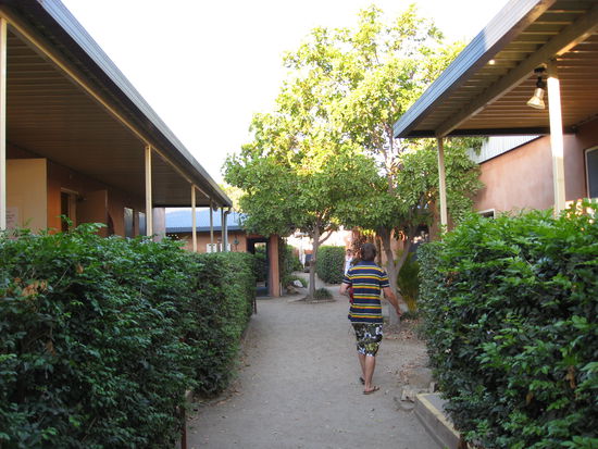 Jetzt mal ein Foto von unserem Hostelzimmer und dem Gang zu den anderen Zimmern, bzw kleinen Haeuschen, Kueche und Bad usw.