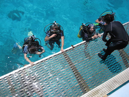 Nach Theorie und Training im Pool ging es am zweiten Tag schon raus ins Meer. Gab zwar leider nicht so viel zu sehen ausser einer Muraene und einem Sting Ray. Aber ich war sowieso noch zu sehr mit der Ausruestung und dem Tauchen an sich beschaeftigt um mich grossartig umschauen zu koennen. Mittlerweile haben wir schon unseren zweiten Tauchkurs gemacht und sind jetzt "Advanced-Diver"