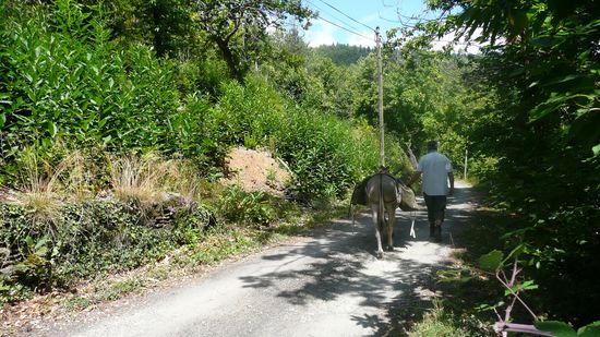 Leider geht es jetzt den Berg wieder rauf und es ist inzwischen längst wieder sonnig und heiß. So ein Esel, der keine Lust hat zu laufen hat, kann ganz schön schwer werden. Ich ziehe und zerre, aber er hat heute einfach keinen Bock. Auch ein paar frische Äpfel können ihn nicht zum schnelleren Gehen bewegen.