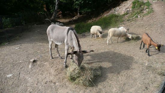 Der zusätzliche Weg zur Badestelle hat ganz schön geschlaucht. Wieder kommen wir gegen halb vier nach nur zehn Kilometern alle drei total erschöpft an unserer heutigen Herberge Le Rey an. Der Empfang ist kühl, ich kenne auch keine Namen der Besitzer, sie sind nirgends angegeben, nicht in der deutschen Wegbeschreibung und auch nicht in ihrem Prospekt, komische Leute. Der Esel bekommt hier nur etwas Heu und das muß er sich auch noch mit einigen kleinen Gemsen und Schafen und einem Kollegen und einem Pferd teilen.[/f]