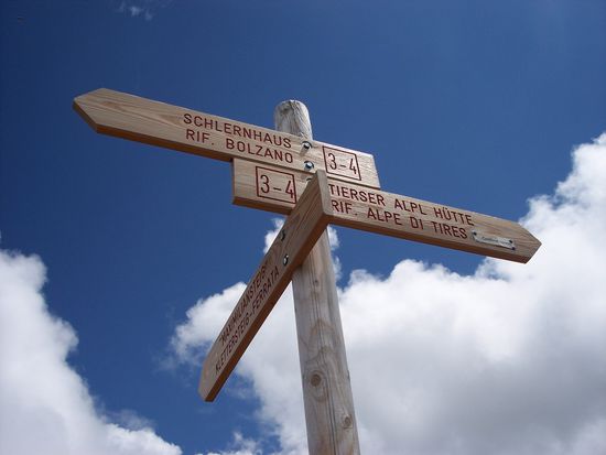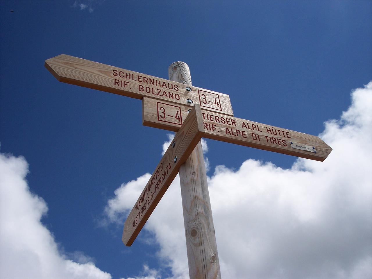 Nachster Tag, strahlend blauer Himmel. Der Karte nach könnte es sich heute bis zum Plattkofel ausgehen.