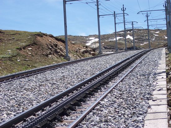 Unweit der Bahnstrecke der Zahnradbahn führt der Wanderweg hinauf zum Gornergrat. Immer mehr Gletscher sind zu sehen und vor dem letzten Anstieg ist noch ein Schneefeld zu durchqueren.