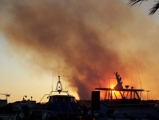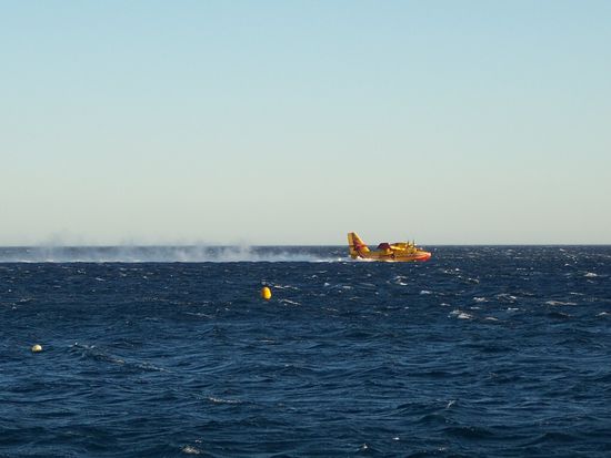 In Marseille wollte ich nicht bleiben sondern irgendwo an die Cote d´Azur. Um 18:00 Uhr ging ein Regionalzug Richtung Nizza. Nach ca. 1,5h Fahrt war in den Wäldern immer mehr und mehr Rauch zu sehen, ein Waldbrand. Löschflugzeuge waren pausenlos zu sehen. Ich bin dann um etwas 20:00 Uhr in St.Raphael ausgestiegen. Da konnte man die Löschflugzeuge schön beobachten wie sie im Meer die Tanks auffüllten und zum Löschgebiet flogen. Eine eigenartige Stimmung wie die Sonne im Rauch unterging.