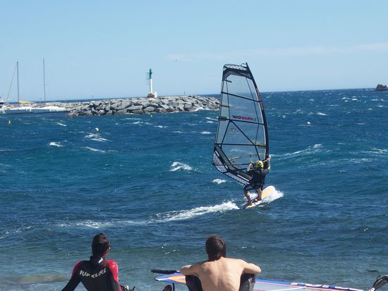 Ich habe auf dem Interrail-Ticket nur noch einen freien Tag zur Verfügung und den habe ich für Morgen geplant um bis Barcelona zu kommen. Da kann ich heute bis am Abend noch hier bleiben. Ich mach mir einen ruhigen Tag am Strand. Durch den Starken Wind ist von der großen Hitze nicht viel zu spüren, und die Surfen freuen sich.