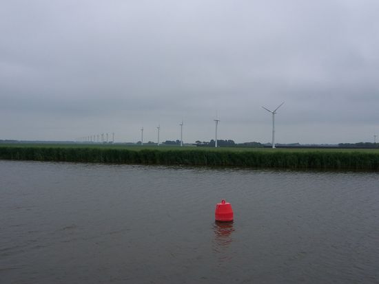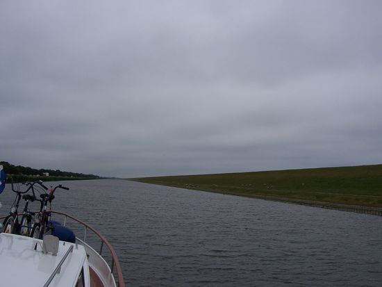 Ein breiter Wasserweg, in den Kurven betonnt, die Ufer Schilf bewachsen, so präsentiert sich uns der Waardkanaal. Die Crew eines flacheren Bootes könnte nicht über die hohen Dämme ins Hinterland gucken.