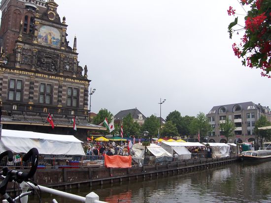 Wir finden einen Platz in einer Gracht mitten in der Stadt mit Ausblick zur alten Waage.