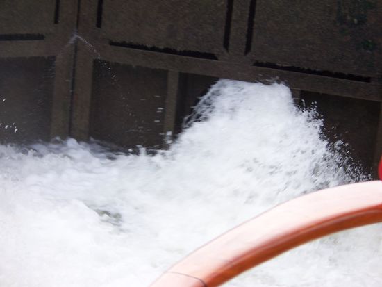 Obwohl die bewaldete Umgebung recht hübsch ist, kann man nicht behaupten, dass es eine gemütliche Fahrt ist. Die Schütze in den Schleusentoren lassen das Wasser in ungebremster Wucht in die Schleuse. Da hat man alle Hände voll zu tun.