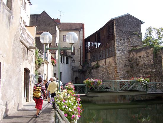 Natürlich erst nachdem man einen Halt eingelegt hat. Der Ort ist zauberhaft, besonders die Teile an den Seitenarmen des Doubs. Hier wurden (werden?) sanitäre Grundprobleme durch kleine, angebaute über das Wasser hängende Häuschen gelöst.