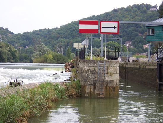 Das Hochwasser des Doubs macht uns die Fahrt nicht leichter. Viele Flutschleusen und - tore sind geschlossen. Das Wasser sprudelt wild über die Wehre, die oftmals unmittelbar neben den Schleusen sind.