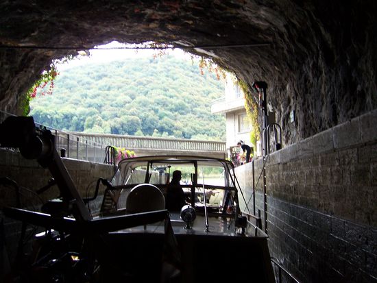 Sehr hohe Schleusenmauern mit sehr wenigen Pollern, tiefe torähnliche Aussparungen in denen die Fender verschwinden. Man muss sehr wachsam sein.
