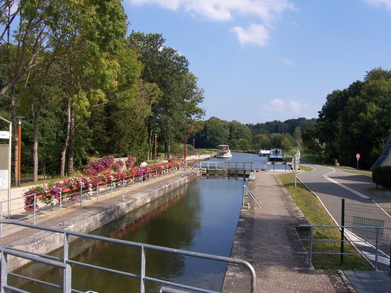 Mit der blumengeschmückten Ecluse 3 Montreux-Chateau hat man die Wasserscheide Rhein-Rhone und das Ende der Franche-Comté erreicht.