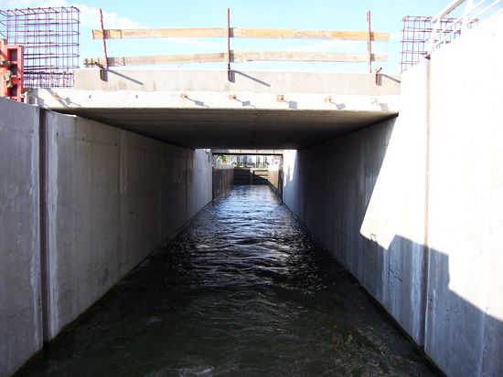 Sie leert sich in einer für das Auge kaum erkennbaren Geschwindigkeit und genauso geht das teure Guillotinentor im Unterwasser nach oben.