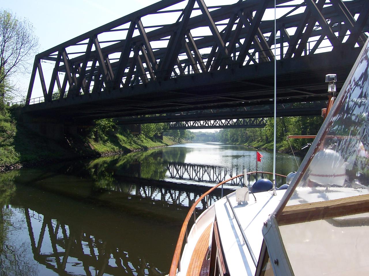 Die Steganlage des Motorbootclub Kettwig ist auch für größere Boote geeignet. Wasser, Strom und Liegen für 1 Euro pro Meter Boot. Leider donnert alle paar Minuten ein Zug über die Eisenbahnbrücke oberhalb der Anlage. Sie ist so niedrig, dass wir unsere Funkantenne legen mussten. Die Flugzeuge machen fast noch mehr Lärm, scheinbar liegen wir in der Einflugschneise Düsseldorf. .