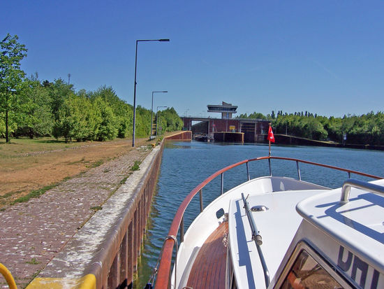 Überall woanders hätte man uns die Schleuse vor der Nase zugemacht, wenn wir noch ein ganzes Stück weg wären und im Oberwasser ein Berufsschiff auf Schleusung gewartet hätte.