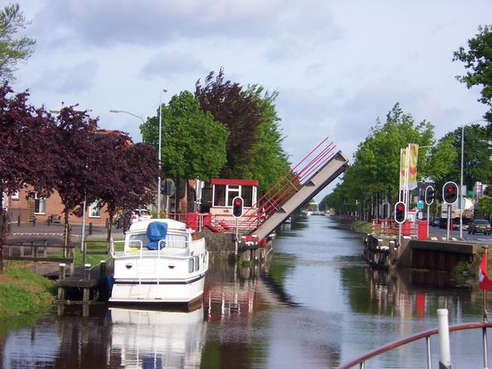 Die nächsten 6 Kilometer stehen uns 30 bewegliche Brücken und 3 Schleusen bevor. Ein ganzes Heer von Schleusen- und Brückenwärtern begleitet uns. Einige der Brücken gehen sogar elektrisch auf.