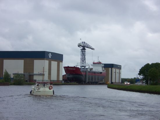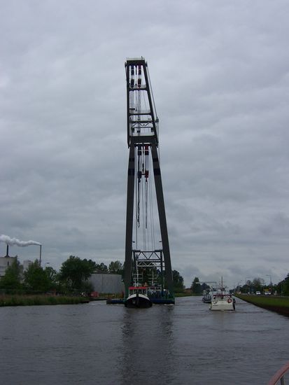 Dieser Weg ist nicht mehr idyllisch aber hoch interessant. Eine Werft baut gerade an einem Ruderhaus für ein Seeschiff, nebenan wird ein Kümo verlängert und gleich darauf kommt uns ein schwimmendes Monstrum entgegen. Ein Schlepper zieht einen Kran und dahinter einen bestimmt 30 m langen Ponton. Wow!