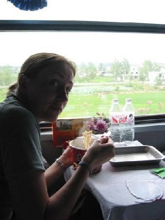 Schliesslich ueberkommt uns der Hunger und da wir es nicht besser wissen und zunaechst denken jeder hat sein eigenes Essen, ausser wir, mitgebracht, pluendern wir die als Souvenir gedachten Kekse, die wir in Guilin gekauft hatten. Bald merken wir aber, dass die Moeglichkeit besteht, sich an den Bahnhoefe, wo wir kurz halt machen, sich etwas zu kaufen. Schliesslich erstehen wir zwei Packungen Reisnudelsuppe, die wir mit heissem Wasser warm machen. Es ist wirklich eine Erfahrung in so einem Zug zu reisen, fast alle koecheln den Tag ueber vor sich hin und gegenueber den anderen Abteilen ist bei uns fast richtig viel Platz. Die anderen Abteile sind komplett offen und 3 Liegen sind hier immer uebereinander gestapelt, einige schlafen auch auf dem Boden, wenn sie keinen Schlafplatz mehr erwischt haben. Ist quasi eine riesige WG mit 400 Mitbewohnern so ein chinesicher Zug
