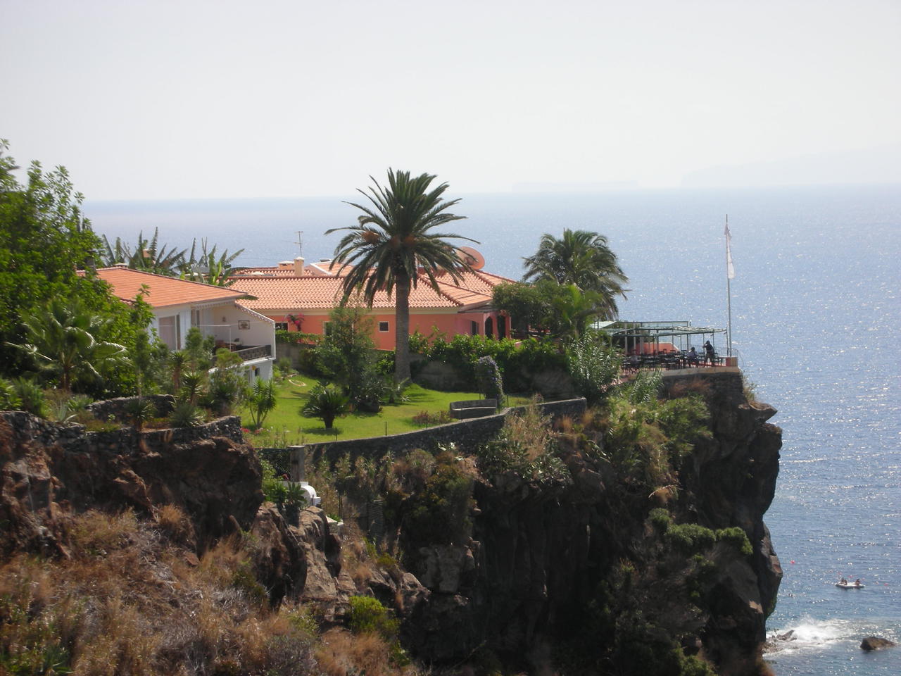 Von Canico, wo wir unser Auto abstellten, sind wir den Fußweg hinunter nach Baixo gelaufen. Es ging ganz schön bergab. Die besagten Hotels lagen zusammen mit Apartment- und schmucken Ferienhäusern in einer sehr gepflegten parkähnlichen Umgebung zum größten Teil auf Klippen direkt am Meer. Hier hatte man für die Gäste terrassenförmig angeordnet Sonneninseln mit kleinen Pools angelegt, der Zugang zum Meer durch Treppen erreichbar. Optisch sah das ganz interessant aus, uns jedoch erschien das alles sehr beengt.