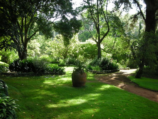 Der angrenzende Garten war im typisch Englischen Stil angelegt, mit einem Teehaus und einer kleinen, barocken Kapelle. Kleine stille z.T. romantische Sitzgelegenheiten waren im ganzen Park verteilt. Der alte Baumbestand, mit Arten aus den verschiedensten Ländern der Erde, hat uns besonders angesprochen.