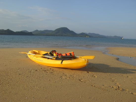 Ein Kajak kostet 1000 Baht; ein Moped 350 Baht; ein Fahrrad 400 Baht,...
