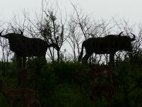 Wenige Minuten später fängt es an zu regnen und wir werden Nass. Dafür entdecken wir aber wenigstens einige weitere Tiere: Breitmaulnashörner, Steppenzebras, Büffel, eine Hyäne die um einen Büffelkadaver schleicht, ein Frankolin, Gnus, Impalas, Affen und einen Bushard.